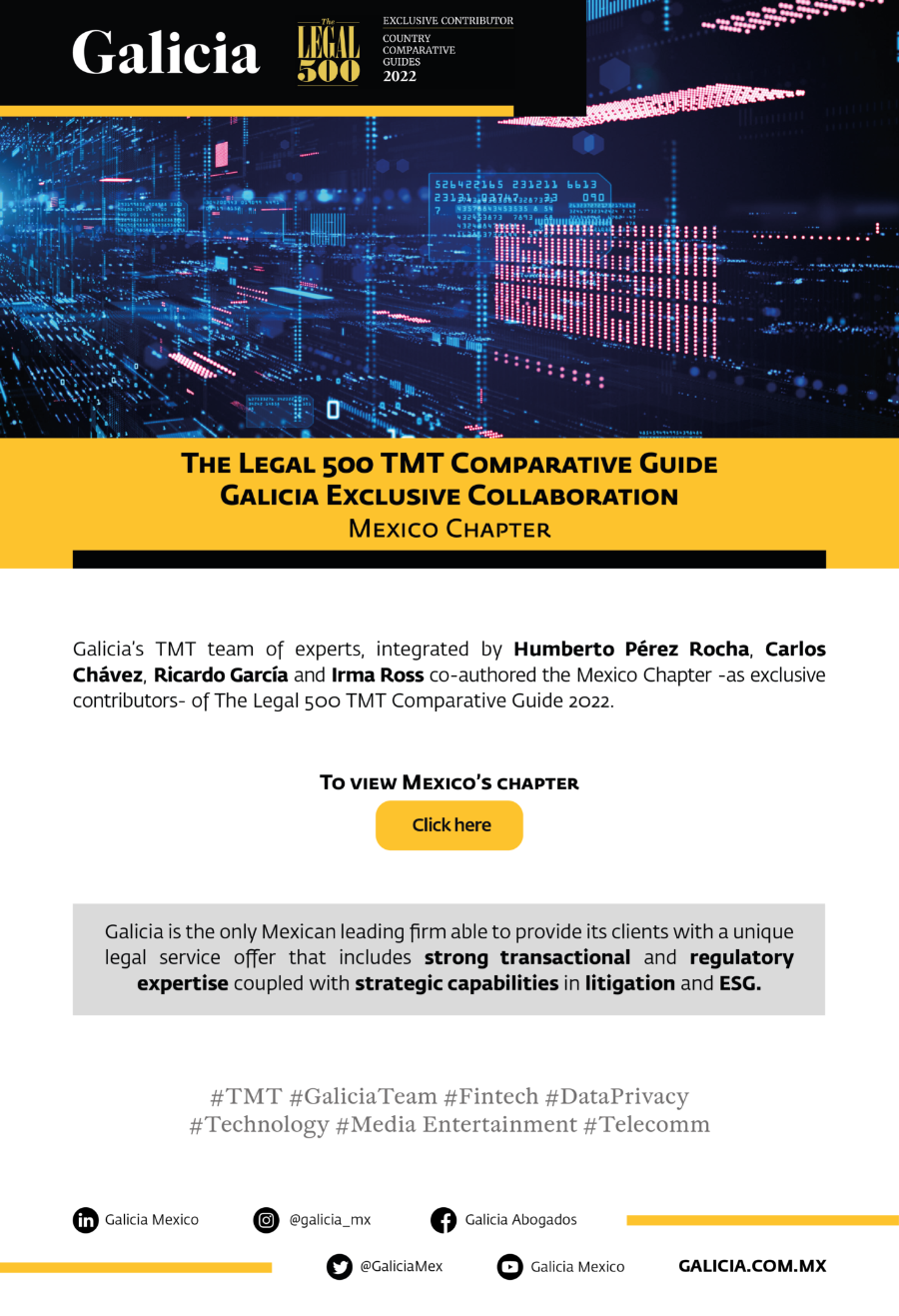 Copyright © Galicia Abogados, S.C. All rights reserved. The contents and publications of this website are protected by the laws and international treaties on copyright in force in Mexico and abroad, in favor of Galicia Abogados, S.C., and third-party owners who have duly authorized their publication on this website. The content and materials on this website may be used solely for personal or educational (non-profit, non-commercial) use, without granting any license or right whatsoever. It is strictly prohibited to remove or alter any copyright legend that states the authorship of the material.