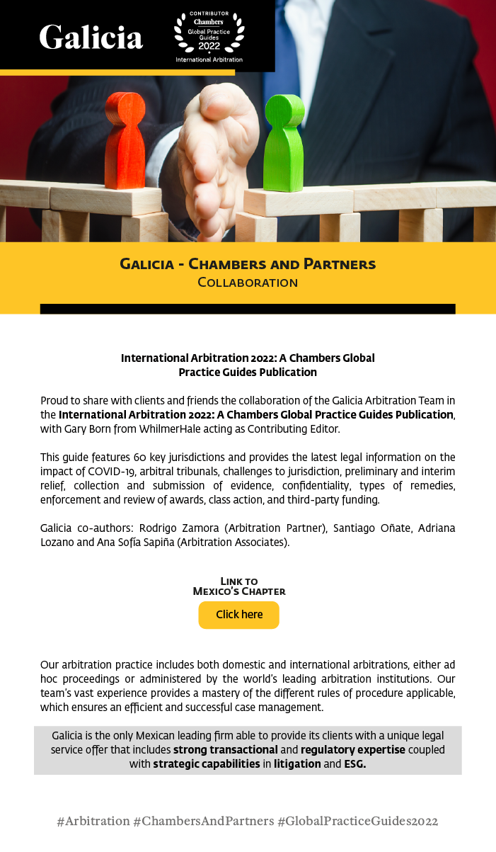 Copyright © Galicia Abogados, S.C. All rights reserved. The contents and publications of this website are protected by the laws and international treaties on copyright in force in Mexico and abroad, in favor of Galicia Abogados, S.C., and third-party owners who have duly authorized their publication on this website. The content and materials on this website may be used solely for personal or educational (non-profit, non-commercial) use, without granting any license or right whatsoever. It is strictly prohibited to remove or alter any copyright legend that states the authorship of the material.