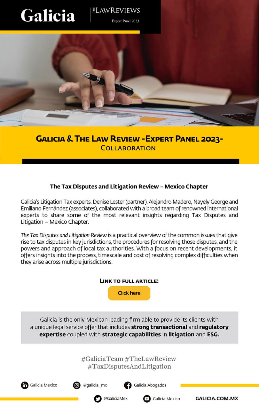 Copyright © Galicia Abogados, S.C. All rights reserved. The contents and publications of this website are protected by the laws and international treaties on copyright in force in Mexico and abroad, in favor of Galicia Abogados, S.C., and third-party owners who have duly authorized their publication on this website. The content and materials on this website may be used solely for personal or educational (non-profit, non-commercial) use, without granting any license or right whatsoever. It is strictly prohibited to remove or alter any copyright legend that states the authorship of the material.