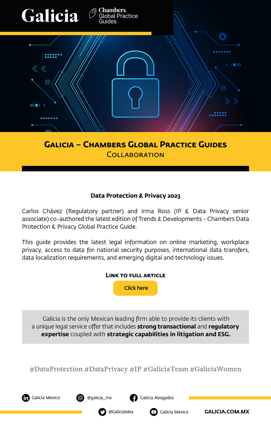 Copyright © Galicia Abogados, S.C. All rights reserved. The contents and publications of this website are protected by the laws and international treaties on copyright in force in Mexico and abroad, in favor of Galicia Abogados, S.C., and third-party owners who have duly authorized their publication on this website. The content and materials on this website may be used solely for personal or educational (non-profit, non-commercial) use, without granting any license or right whatsoever. It is strictly prohibited to remove or alter any copyright legend that states the authorship of the material.