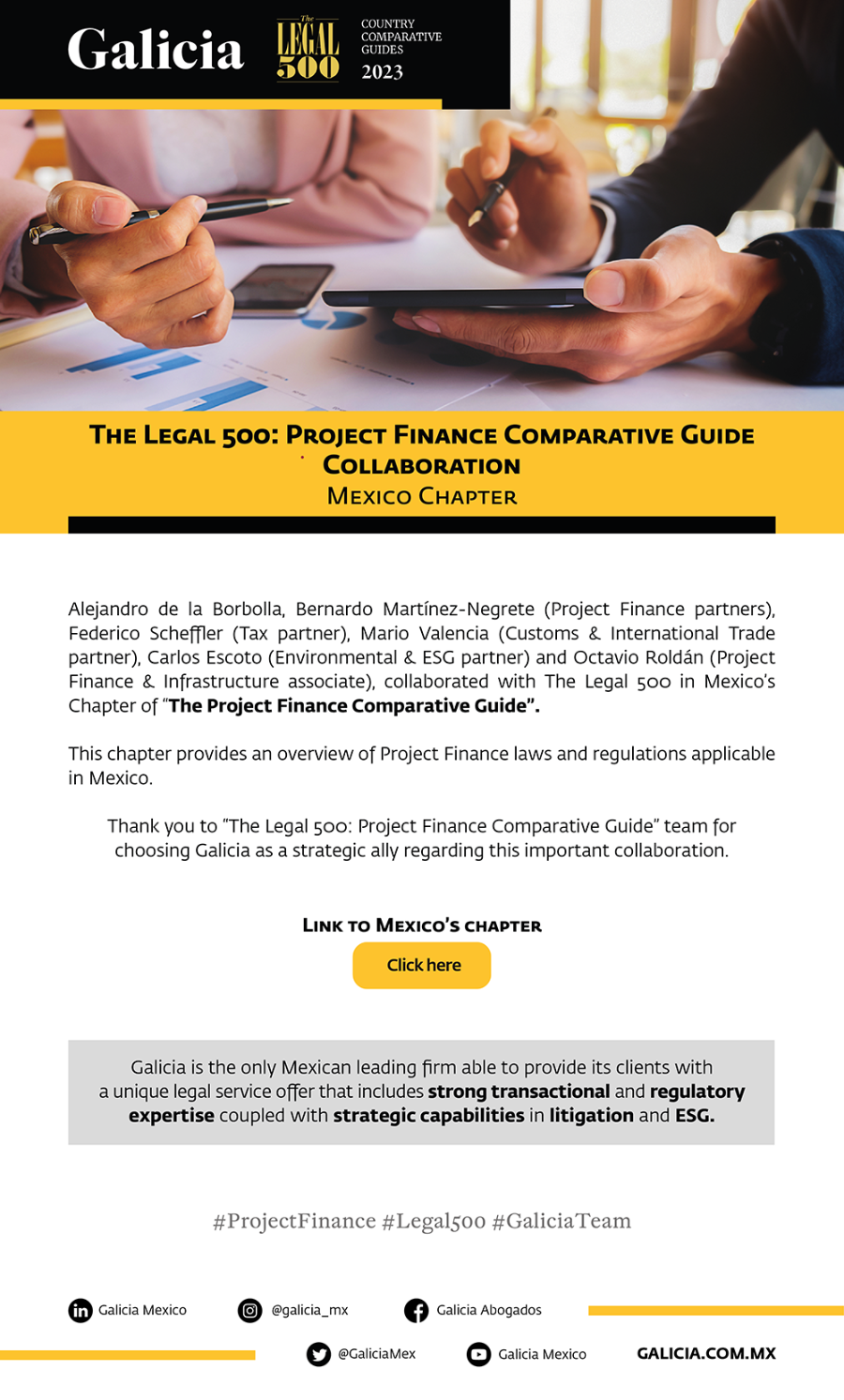 Copyright © Galicia Abogados, S.C. All rights reserved. The contents and publications of this website are protected by the laws and international treaties on copyright in force in Mexico and abroad, in favor of Galicia Abogados, S.C., and third-party owners who have duly authorized their publication on this website. The content and materials on this website may be used solely for personal or educational (non-profit, non-commercial) use, without granting any license or right whatsoever. It is strictly prohibited to remove or alter any copyright legend that states the authorship of the material.
